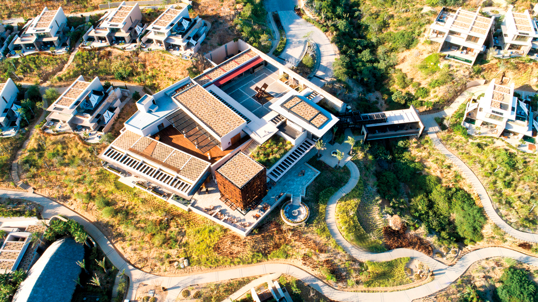 Con este objetivo de respetar el medioambiente, la sustentabilidad siempre se mantuvo como el enfoque central. Por ejemplo, la vegetación endémica del lugar fue trasladada a un vivero y replantada después en el terreno cuando terminó la construcción. Para reducir el gasto energético, en lugar de poner un recirculador de agua caliente por todo el predio, como en un inicio marcaban los estándares del grupo internacional, instalaron calentadores de bajo consumo de manera más individualizada. Además, las azoteas se trataron con grava, arena y vegetación desértica para “generar un colchón de aislamiento en las habitaciones y bajar la carga de asoleamiento”, explica el arquitecto. Y, como parte característica de la arquitectura, se colocaron unos grandes volados en color negro, que también reducen el impacto del Sol y el empleo del aire acondicionado.
