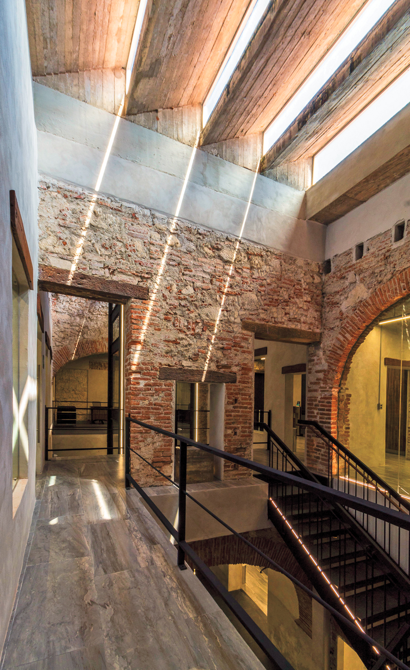 RED Arquitectos combinó el lenguaje del edificio histórico con uno más contemporáneo al replicar los vanos rectangulares pero con materiales más modernos, como el metal y el concreto, lo que genera un entorno más fresco cuando se atraviesa el inmueble, que cuenta con la entrada de luz por medio de los tragaluces y que, en palabras del despacho, en esa zona se puede transitar, leer y entender el pasado.