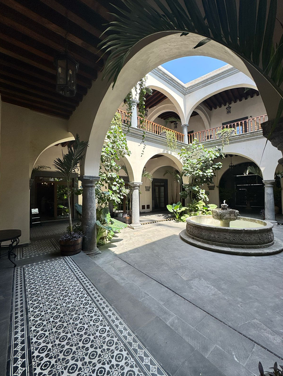 junto a una pequeña tienda. El corredor da vista al patio, una fuente de piedra con líneas talladas y unos