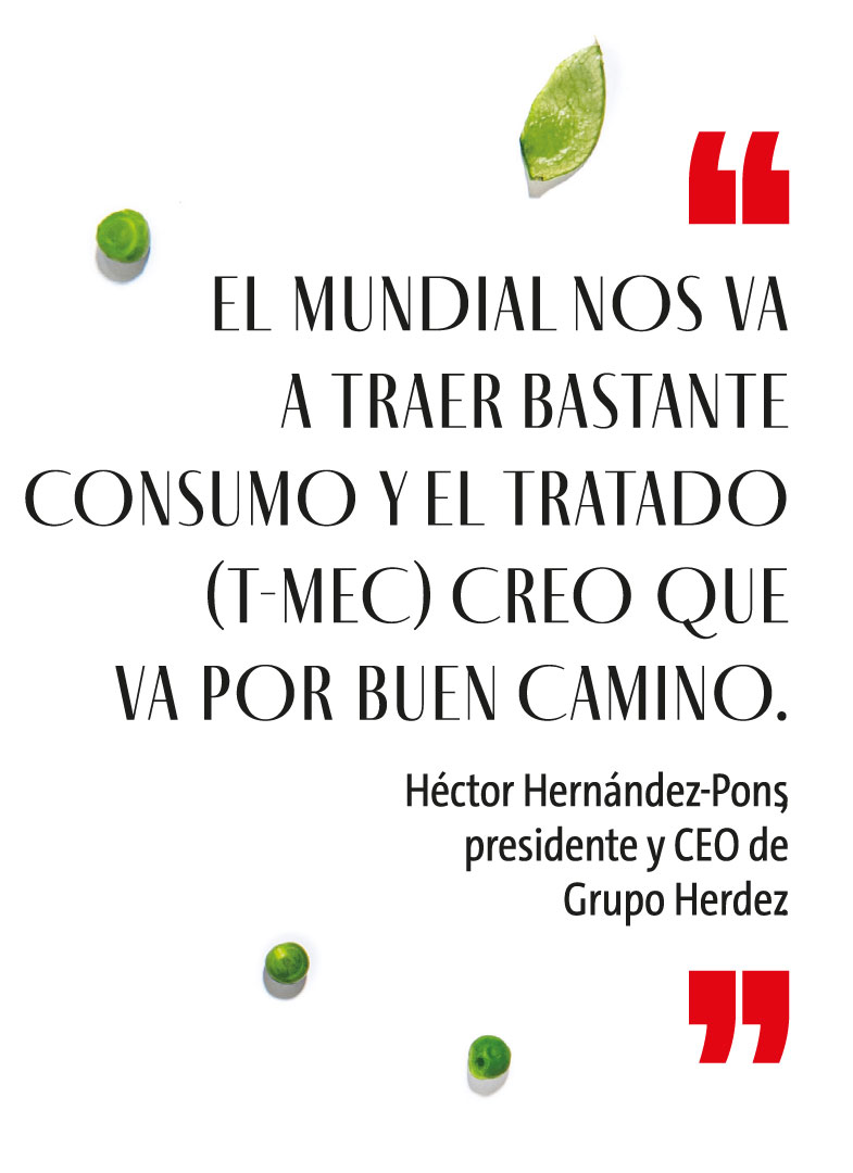 Los ojos de la mayor parte de las compañías de Norteamérica están puestos en dos eventos este año: el mundial de futbol y la revisión del T-MEC. Pero Grupo Herdez tiene el foco en algo más. “El mundial nos va a traer bastante consumo y el tema del tratado creo que va por buen camino”, dice Hernández-Pons.